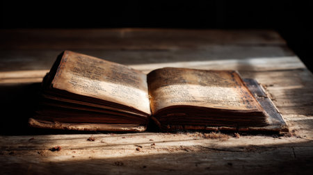A vintage open book rests on a wooden surface, displaying its worn pages that evoke a sense of nostalgia and timeless storytelling. Perfect for literary themes.