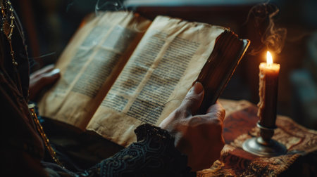Hand turning ancient book page by candlelight with smoke rising