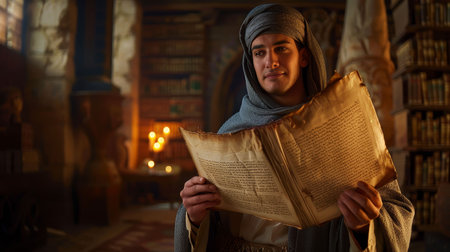 Ancient Scholar, Papyrus Scroll, Wielder of Hidden Knowledge, In the Great Library of Alexandria, Illuminated by Candlelight, Realistic, Golden Hour, Depth of Field, Handheld shot view