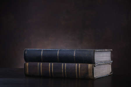 Stack of old worn shabby Jewish books in leather binding in the dark. Closeup. Selective focus. Low key