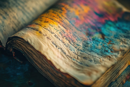 A close-up view of an ancient book featuring vibrant, colorful pages filled with delicate handwriting.
