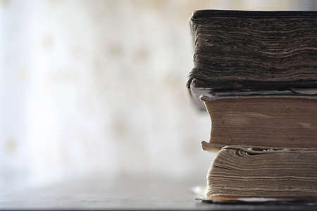 Stack of old worn shabby Jewish books in leather binding in the dark. Closeup. Selective focus. Low key