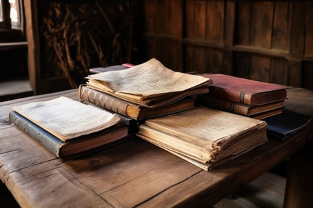 close-up of old manuscripts placed on a wooden table, created with generative ai