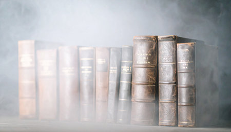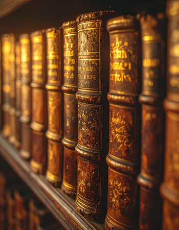 leather bound book spines with embossed titles, shallow focus for moody ambiance
