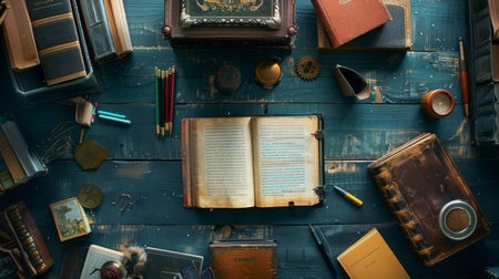 A table adorned with a colorful array of books and various writing implements, creating an inviting space for creativity and inspiration. Generative AI