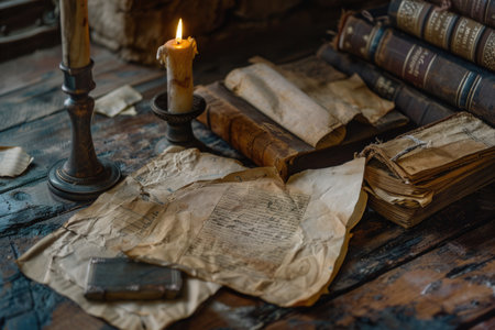 A collection of aged books and scrolls rests on a rustic table, softly illuminated by a flickering candle, revealing their historical significance.