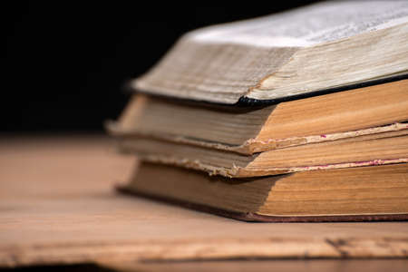 Stack of old worn shabby Jewish books in leather binding in the dark. Open page of Torah. Closeup. Selective focus. Low key