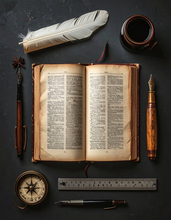 An old, leather-bound book open on an antique desk, with a quill pen and ink bottle adding to the vintage feel.