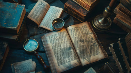 Collection of vintage books with a magnifying glass on a rustic wooden table, evoking themes of history, knowledge, and study in a nostalgic setting.