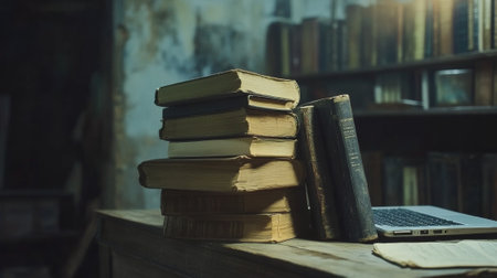 Stack of old books with worn covers lying on a wooden desk in a library or archive