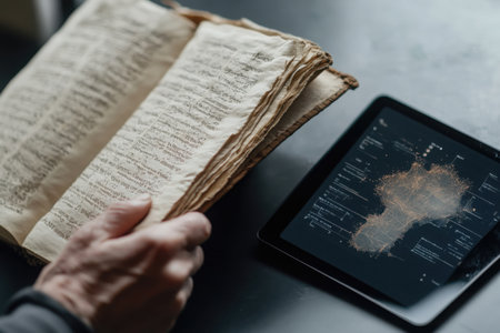 A hand gently holds an open ancient manuscript, showing delicate pages. Beside it, a digital device presents a detailed map filled with complex data visualizations.