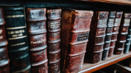 A close-up view of antique leather-bound books arranged on wooden shelves, capturing the essence of timeless literature and the rich history of storytelling in a vintage library.