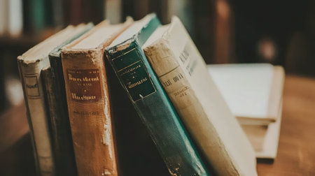 This image features a collection of vintage book spines set against a warm library backdrop. The scene captures the essence of literature's history and the joy of reading.