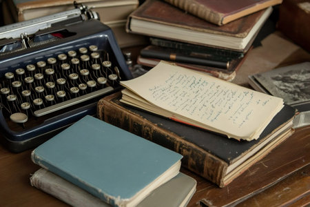 Typewriter and aged books with handwritten text, symbolizing storytelling, classical literature and education