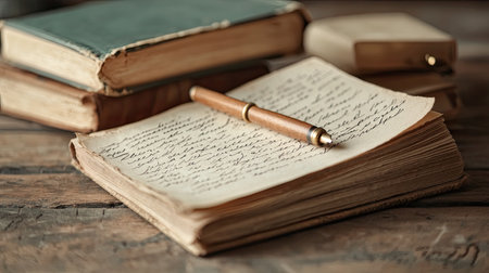 A vintage scene featuring aged books, an elegant ink pen, and handwritten pages on a rustic wooden table evokes nostalgia and creativity, perfect for educational or literary themes.