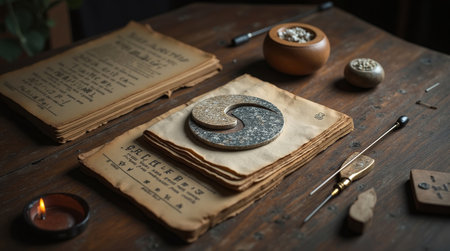 Eastern healing practices captured in a harmonious still life. Acupuncture needles, Yin Yang symbol, and sacred scrolls reflect balance, energy, and spiritual tradition.