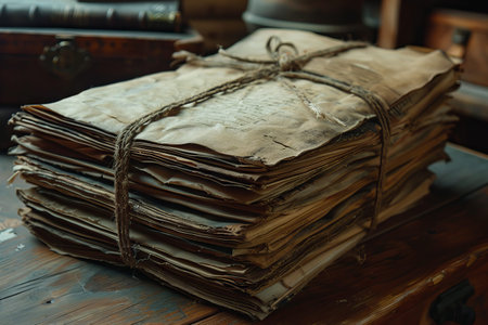 A stack of old papers with a rope tied around them. The papers are yellowed and appear to be fragile