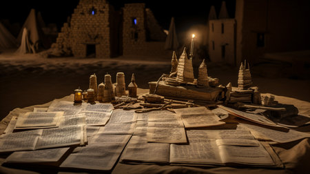 A collection of ancient books, scrolls, and artifacts lies scattered on a rustic table, revealing the rich history captured within.