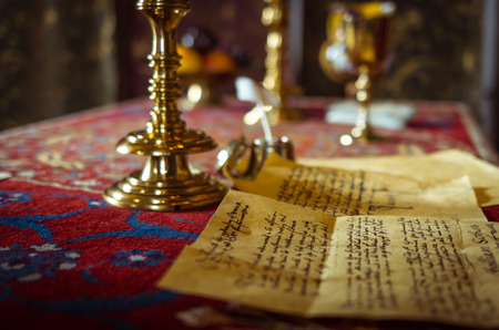 A papyrus scroll with a feather, an inkwell against a lit candle and a cross, against a dark background