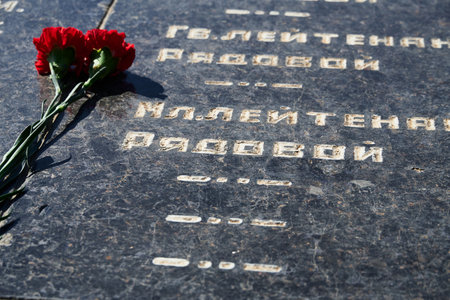 flowers on the memorial to fallen soldiers, red carnations on black marble, Russian text of soldiers military rank - sergeant,major, colonel,Lieutenant Colonel, private, corporal