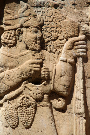 Closeup of a carved stone lamassu, a protective deity in Persian mythology