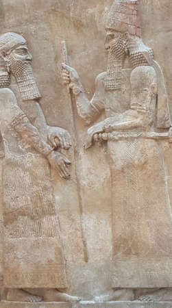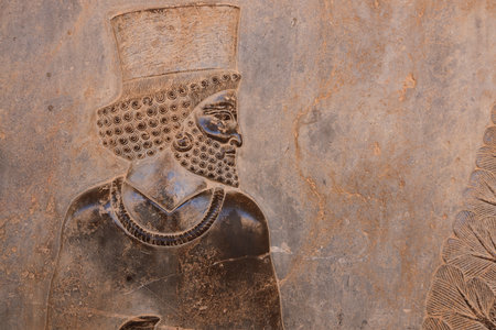 Ancient wall with bas-relief with assyrian warriors, Persepolis, Iran. Horizontal background with embossed image persian bearded man. Mock up template. Copy space for text