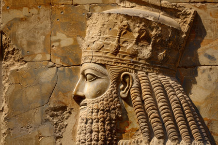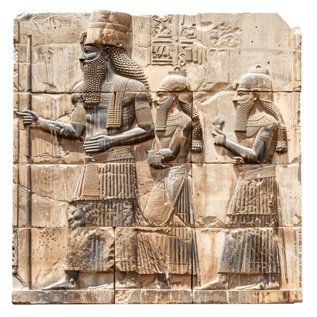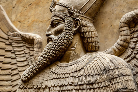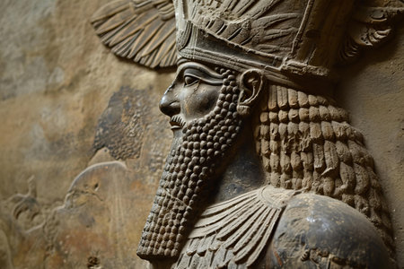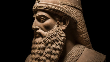 Ceremonial Ancient Assyrian relief sculpture. Historical archaeology stone carved statuary. Generate ai