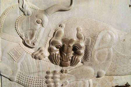 Shiraz, Iran - June, 2007 : Bas-relief of a bull and a lion at the ruins of Persepolis in Shiraz, Iran. This Bas-relief is the symbol in Zoroastrian for Nowruz and eternally fighting Moon and Sun.