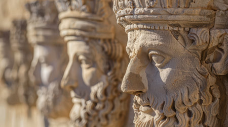 The image showcases a close-up view of three ancient stone sculptures of men wearing crowns. The sculptures are carved in high relief and are weathered from time. They are likely part of a larger architectural element and stand side-by-side, each with a distinct expression.