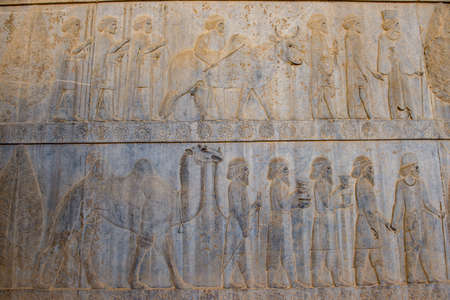 Stone bas-relief of residents of historical empire with animals carved on the stairway facade of the Apadana at the old city Persepolis.
