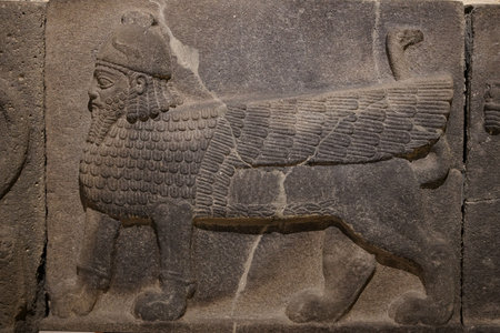 LONDON - MAY 15 2015:Human Headed Winged Lions and reliefs from Nimrud with the Balawat Gates, c. 860 BC.The Museum contain special antiques taken from Greece, Rome, Egypt and many different countries