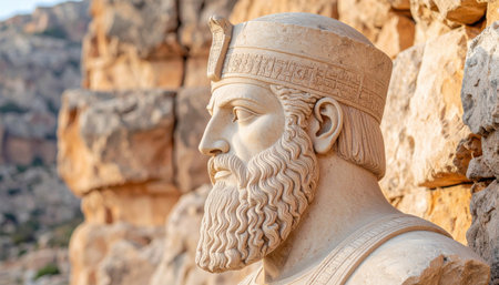 A stone statue of an ancient ruler with intricate beard and headpiece set against a rocky landscape, representing historical sculpture and heritage.