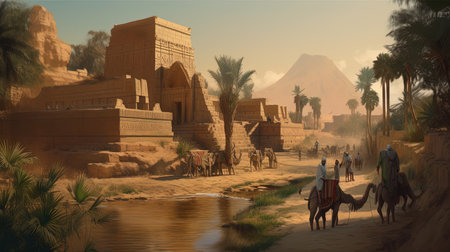 Decorated Old wall painted with Assyrian queens. Ancient historical Babylonian female civilization stone drawing. Generate ai