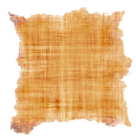 Depicting a flat, slightly worn ancient papyrus sheet with the texture of linen fabric and small scribbles in greek characters on it, isolated against white background.