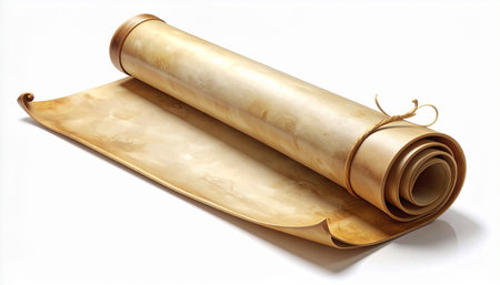 Unfurling a parchment scroll on a white background.