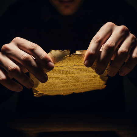 An antique paper fragment, its edges darkened by fire, lies under a gentle golden light. The shallow depth of field highlights its rustic texture.