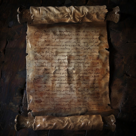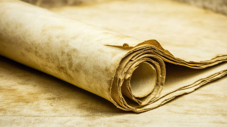 This image showcases an ancient scroll made from aged parchment, featuring faded text that evokes a sense of history. Ideal for cultural and educational use.