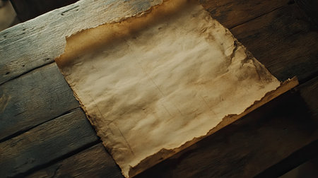 Parchment paper rests on a wooden surface, revealing text and shadows that create a historical and cinematic look in the setting