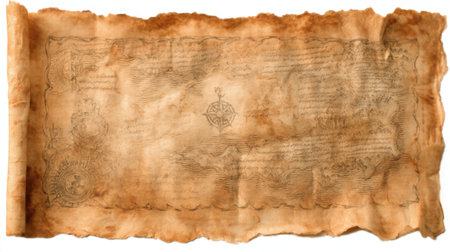 An ancient parchment scroll featuring intricate illustrations and a compass design, perfect for storytelling, historical context, or artistic projects.