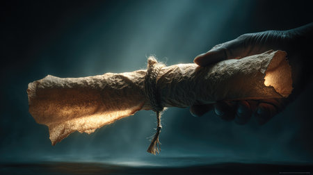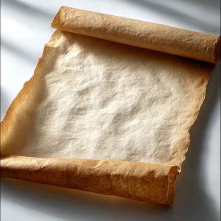 Ancient Scroll Fragment - A delicate piece of rolled parchment paper with authentic aging characteristics.