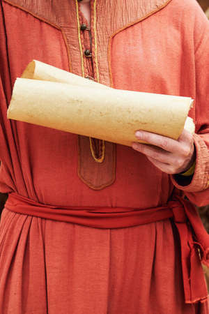 A man in vintage medieval clothes with a paper letter in his hand. Reconstruction of the events of the Middle Ages in Europe