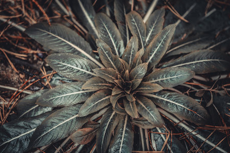 Top down shot of a plant with Long Leaves, Foliage, Selective Focus, Moody theme.