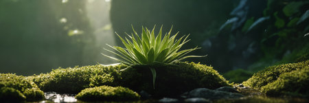 A delicate fern unfurls its fronds atop a mosscovered rock in a lush forest. The soft focus background enhances the serene and vibrant green beauty of the scene.