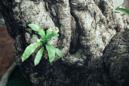 Green fern leaf on the tree stump