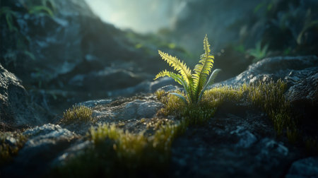 A vibrant fern thrives among rocky terrain, showcasing the beauty of nature. This serene scene captures growth, tranquility, and the essence of wilderness.