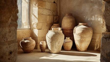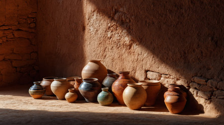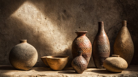 An assortment of aged pottery vases sits indoors against a textured stone wall, bathed in soft, natural light. The earthen vessels display various sizes and shapes, with rustic surfaces and neutral tones. This composition evokes history and is suitable for illustrating themes related to culture or historical contexts.