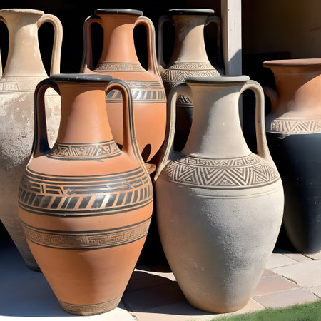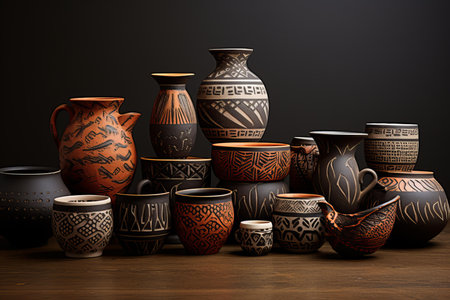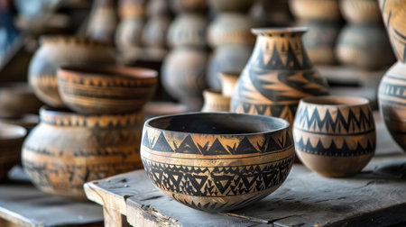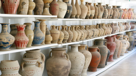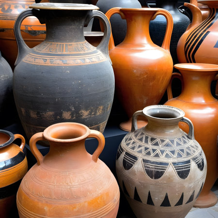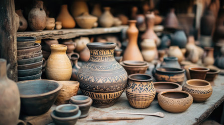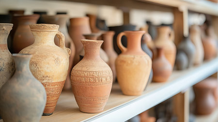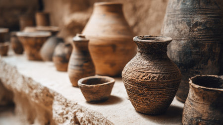 A beautiful arrangement of ancient pottery artifacts showcasing unique designs and craftsmanship. Ideal for cultural and historical themes in art.