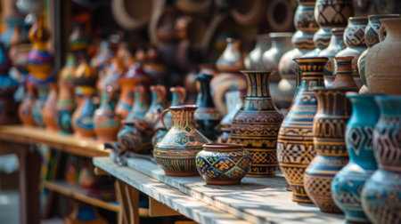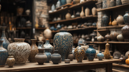 A stunning display of rustic pottery and colorful artifacts on a wooden shelf, representing rich cultural heritage and exquisite craftsmanship in art.