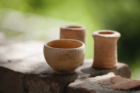 Roasted ceramimc products without glaze. Top view, closeup. Art and business, hobby and freelance working concept.