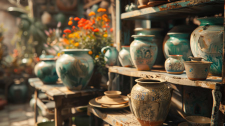 A charming array of handmade clay pottery arranged on rustic wooden shelves, showcasing the beauty of craftsmanship and the warm tones of earthen materials in a cozy workshop setting.